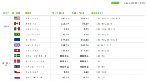 とはいえ、不安な場合は現金を持ち歩くといいでしょう。比較として、成田空港にある両替窓口「GPA」の為替レートを見てみると、「2025年8月6日10時56分」のレートで、米ドルは円からの両替が150.33円、ユーロの場合は174.88円となっていました。