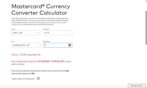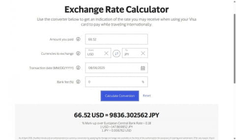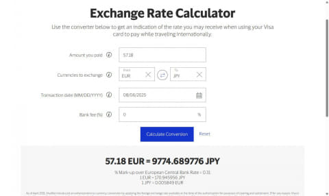 さて、クレジットカードでは、これに加えて各カード会社が設定する海外事務手数料などの手数料が追加されます。VisaやMastercardのサイトでは、「Bank fee」とあるのがそれにあたります。上記は為替レートだけを考慮したため、これを0にしてあります。