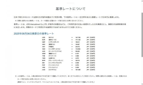 さらに特殊なのがJCBです。海外ではVisaやMastercardほど使える場所が多いわけではないのですが、意外に各社の事務手数料が抑えられています。JCBは国際ブランドとカード発行会社という2つの側面を持ちますが、国際ブランドとしての基準レートは、前述の同タイミングでドルが147.755円、ユーロが171.129円など。少しレートが異なります。