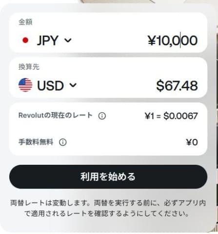Revolutの場合、為替レートはドルで147.12円、ユーロで170.19円でした。1万円では67.98ドル、58.76ユーロとなります。100ドルは14,715円、100ユーロは17,019円。Revolutがチャージできるのは39通貨。手数料はスタンダードプランだと30万円まで無料ですが、それ以上だと0.5%発生。週末に手数料1%(スタンダードプラン)が発生する場合もあります。