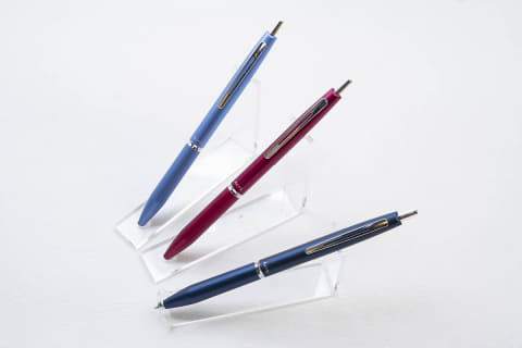 「サラサクリップは軸が樹脂で出来ていますが、こちらは金属製で重量感があり、金パーツで高級感を演出しています。『サラサクリップ』と同じゲルインクですが、万年筆で使われるようなビンテージカラーを採用しているのがこのモデルの特徴です。軸の色に対応したカラーインクが使われていて、どの色も落ち着いたシックな色合い。黒とは違ったやさしい雰囲気で個性を出すこともできる、この価格帯の売れ筋のモデルです」