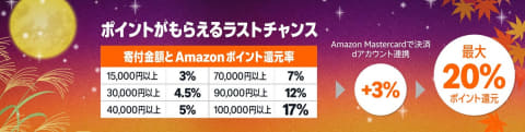 Amazonふるさと納税は、15,000円以上の寄付で最大20%のポイントを還元するキャンペーンを9月30日まで実施中。