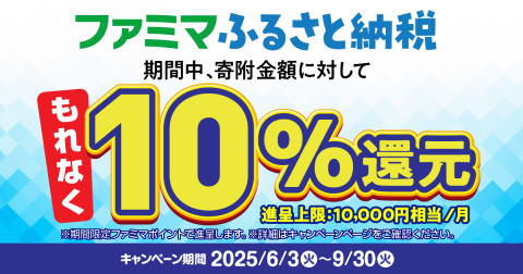 ファミリーマートのファミマふるさと納税は、9月30日までの寄付申込みで、寄付金額の10%相当のファミマポイントが付与されます(上限10,000円相当)。さらにファミマふるさと納税に新規会員登録すると、抽選で50名にファミマポイント10,000円相当を付与するキャンペーンも同時に実施中です。