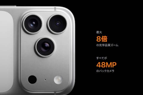 iPhone 17 Proシリーズでは、カメラが大きな特徴となっており、リアカメラは「48MP Pro Fusionカメラシステム」で、48MP Fusionメインカメラ(24mm)。48MP Fusion超広角(13mm)、48MP Fusion望遠(100mm/4倍)の3つのカメラから構成されます。