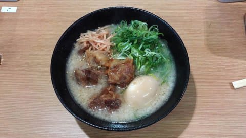 さっそく7月のオープン直後に食べてみたところ、白・赤・黒のとんこつスープと極細麺は、博多駅の「まるうま」とは、確かに全然違う。しかし、トッピングで付くバラ軟骨・スペアリブが噛むごとに味わい深く、肉のうまみが溶けだした部分との味のコントラスト・変化を味わえる、なかなか楽しい一杯であった。