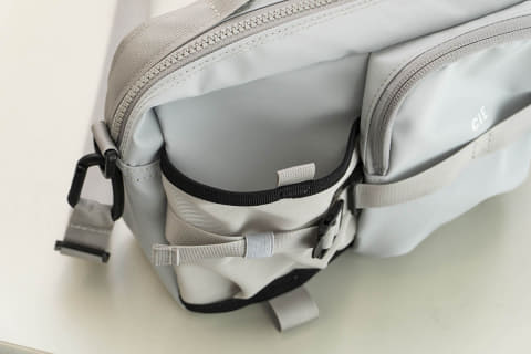 「一番の特徴は、小型ながら拡張できるところです。サイドベルトの調節で拡張でき、荷物を入れたらベルトを引っ張って体にフィットさせることができます。折りたたみ傘を持って行くときは拡張する、ペットボトルを飲み終わったら収納してスリムにする、といった使い方ができてとても便利。本体の両脇にはサイドポケットがあり、カギやワイヤレスイヤホンなど、荷物に埋もれがちなものを収納できます」