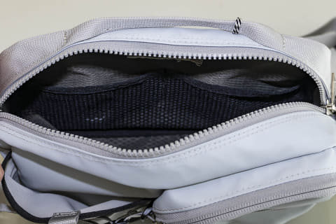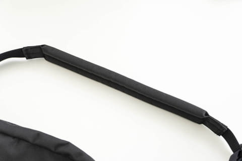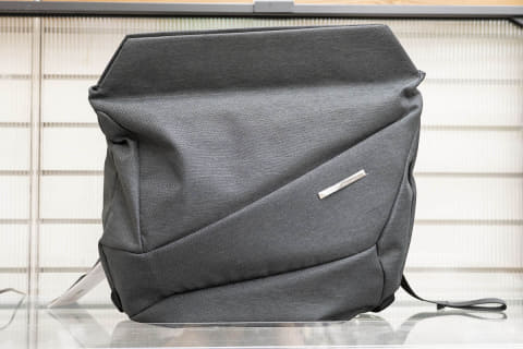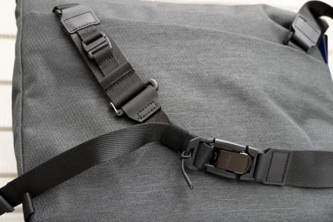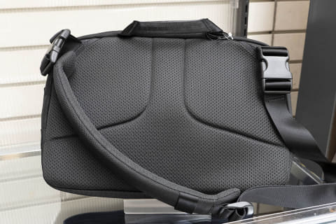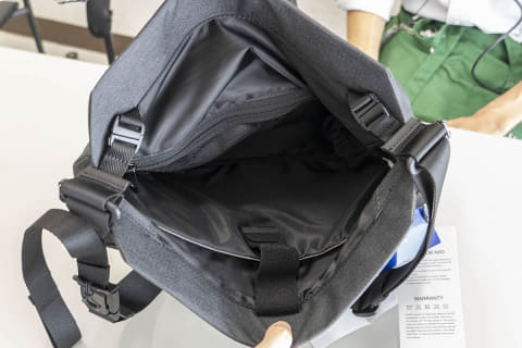 「ショルダースタイルでは14型PCが収納でき、ショルダーストラップの取り付け位置を変えるとトートバッグに変形して、16型PCを収納できるサイズまで広がります。容量はスリングモードで7.5L、トートモードで10Lなので、荷物に合わせてトランスフォームが可能。このほか、ショルダーストラップを使ったギミックがいろいろあるので好みのままにスタイルチェンジを楽しめます。体にぴったりつけてメッセンジャーバッグのように使う時は、マグネット式の開閉バックルで簡単に脱着できるのもポイントです」