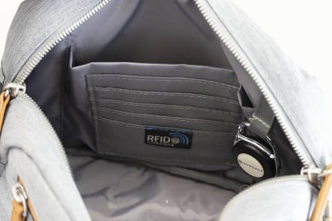 「機能が盛りだくさんのバッグですが、一番の特徴はスキミング防止機能付きのカードケースを搭載しているところです。伸びるタイプのキーホルダーやペンホルダーが付いているほかポケットもたくさんあるので、ものを探すのに時間や手間を取られたくない方におすすめ。マグネットで開閉する前面のポケットは入れたものが傷つきにくい裏地を使っているので、サングラスやスマートフォンをそのまま入れても安心です」