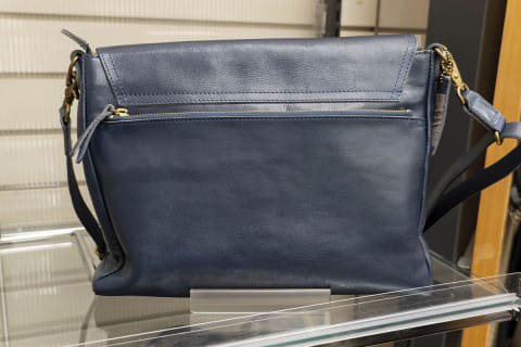 「姫路レザーを使用した光沢感のある国産ショルダーバッグです。シンプルなデザインですが、ネイビー、ブラック、ブラウン、グレーの4色展開なので、色で個性を出すことができます。A4サイズが入るゆったりサイズで、フラップにはばたつき防止のマグネットを搭載。内側にはファスナーポケットや携帯用ポケットが付いています」