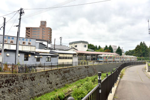 中央弘前駅から大鰐線の線路は南へと延びています。そして線路に沿って流れているのが土淵川です。線路と土淵川は次の弘高下(ひろこうした)駅まで、交差をしながら並走します。