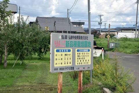 JRの石川駅を後にして、先ほどの分かれ道まで戻ります。そして、逆の方向へ歩いていくと奥羽本線の線路を渡ります。そのまま線路沿いを歩くと、右手に奥羽本線、左手に大鰐線に挟まれた小径があります。そこを歩いているとリンゴ畑が現れ、新品種の栽培園地であることを示す看板が立っていました。