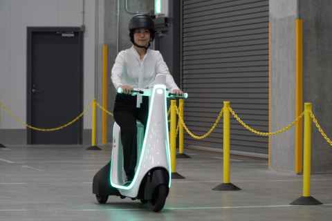 現在も開発中ですが、スタッフが実際にその走りを披露。Unimoは同社初となる三輪構造とリーンアシスト制御を採用する、座るタイプのモビリティです。このリーンアシストが肝となる部分であり、車速とハンドル角度の情報から車体の傾斜角を制御し、二輪車サイズの狭い車体でも高い安定性を実現できる技術だといいます。