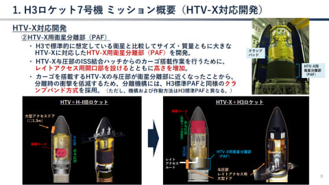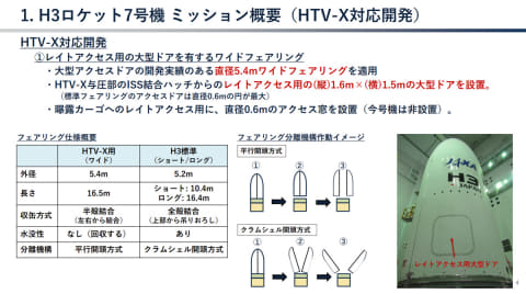 HTV-X仕様のワイドフェアリングは、大型タイプに実績のある海外メーカーが製造しています。これまで成功した方式を踏襲しているため、フェアリングの開き方も通常タイプとは異なります。