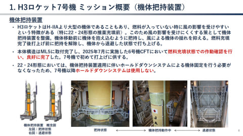 H-IIAよりも大型化したH3ロケットが打上げ準備中に横風の影響を受けないように開発された機体把持装置が今回初めて実際に使用されます。さらに新しい機能として「自律飛行安全システム」の実証が行なわれます。