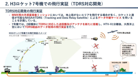 H3-24形態は、H3初の惑星探査ミッションである「MMX」を担う機体です。実用衛星と異なり、惑星探査向けの打上げの際には地上局が設置されていないコースを飛行する必要があるため、その準備としてH3ロケット7号機でNASAの通信衛星「TDRS(Tracking and Data Relay Satellite)」との通信実証を行ないます。