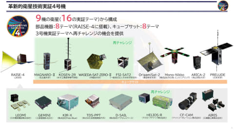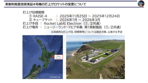 革新的衛星技術実証4号機は、本来はRAISE-4と8機の超小型衛星(キューブサット)の相乗りミッションでした。搭載ロケットの変更に伴い、8つの衛星、名古屋大学の「MAGNARO-II」、米子工業高等専門学校の「KOSEN-2R」、早稲田大学の「WASEDA-SAT-ZERO-II」、未来科学研究所の「FSI-SAT2」、東京科学大学の「OrigamiSat-2」、大日光・エンジニアリングの「Mono-Nikko」、青山学院大学の「ARICA-2」、日本大学の「PRELUDE」は2026年1月から3月までの間に、もう1機のエレクトロンロケットで打上げられることになります。
