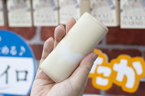 「缶コーヒーをモチーフにした『ポケットウォーマー』は、手のひらで握るだけで手軽に暖を取ることができる携帯カイロです。USB Type-C対応の充電式で弱は45℃、強は55℃と従来のカイロよりも設定温度はやや高め。容量5,000mAhのモバイルバッテリーとしても使うことができます」