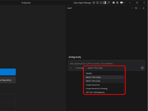 従来のGemini 2.5は当然として、他社のAIモデルと比較してもはるかに高い推論性能を達成したとされるGemini 3を、AntigravityではコーディングのAIアシスタントとして簡単に利用できるのが特徴です。