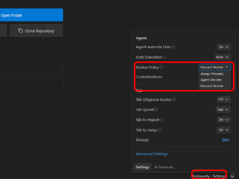 ちなみに同様のAIコーディングツール、たとえばClineは設計のみの「Plan」とコーディングを実行する「Act」の2つを切り替えられますが、AntigravityのPlanningは設計だけでなくコーディングも行なう場合があるので注意が必要です。1つ1つ確認しながら進めたい場合は、ステータスバー右端にある「Antigravity - Settings」から「Review Policy」で「Request Review」などを選んでおくと安心です。