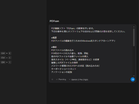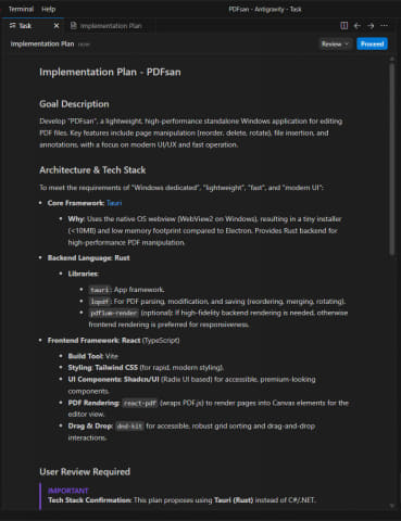 まずはアプリ名や実現したい機能など、PDFエディタの要件を手元でまとめ、それをチャット欄に貼り付けます。AIモデルはGemini 3 Pro Highを選び、Planningモードで実行。1~2分で「タスクリスト」と「実装プラン」が自動生成され、どのような考え方やフローで開発していくかをユーザーに提示します。これらの中身を確認して、必要に応じて追加の指示を行ない、「Proceed」で承認すればその計画に沿ってAIがプログラミングを開始します。