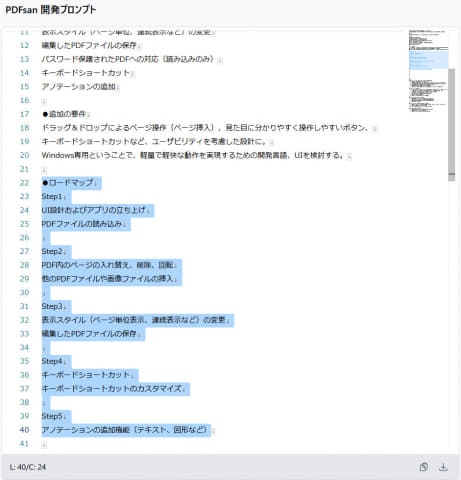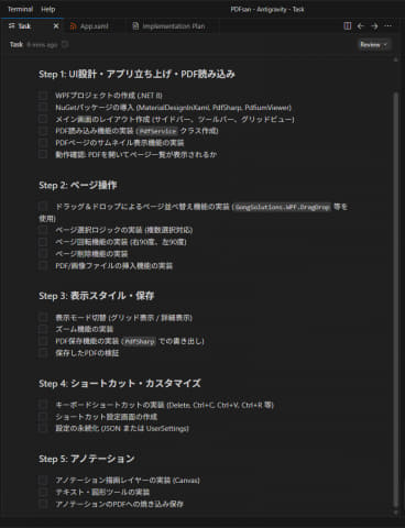 筆者が最初に指示したプロンプトでは、実装計画を5つのステップに分けました。Step1ではシンプルにPDFファイルを開いてサムネイル表示するだけ。Step2ではページの入れ替えや回転、削除、挿入などの機能の追加。Step3ではファイル保存機能を実装する、といった感じです。