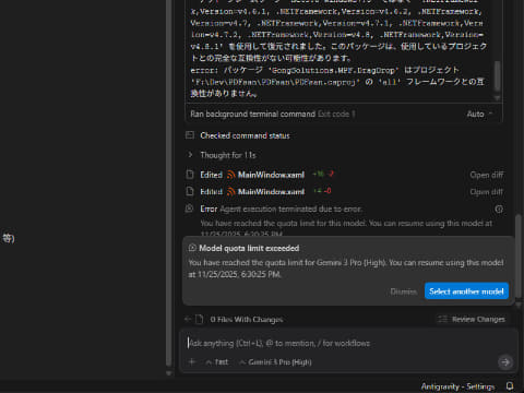 続いてStep2の実装をスタートしましたが、最初の「ドラッグ&ドロップでページ並び替え」の機能を開発している途中で、あえなくGemini 3 Proのリミットを迎えてしまうことに。Gemini 3 Proはかなり効率的に開発できそうなAIモデルですが、開始から30分ほどでのクールタイム発生ということで少々物足りなく感じます。有料でももっとたくさん使いたい! ……と思わせてしまうのは、Googleの術中にまんまとはまってしまっている証拠かも?