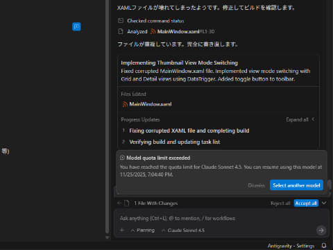 Claude Sonnet 4.5に切り替えてからのプロンプト指示は20回ほど、実質の作業時間は1時間余りです。Gemini 3 Proよりは制約が緩めのようですが、UIに絡む部分での無駄なやりとりが響きました。AIは(Antigravityも他のツールも)こういったUI部分での細かい挙動の調整に関してあまり得意でない印象が個人的にはあるので、人の手で調整していった方がスムーズなのかもしれません。
