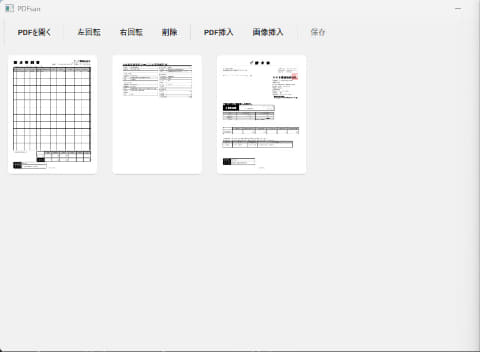 結果、PDFファイルを開いてページの回転、削除、並び替え、別ファイルからのページ挿入、といった機能まで実装したアプリができあがりました。編集したPDFファイルを保存することはできないので、ツールとして役に立つレベルではありませんが、トータル2時間ほどの作業でここまで仕上がるのであれば万々歳、というのが筆者の感想です。