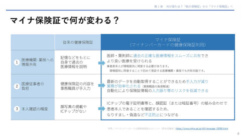 詳細は別記事で紹介していますが、マイナ保険証では、マイナンバーカードのICチップを「確実な本人確認」として利用します。これにより「オンライン資格確認等システム」で管理される医療情報を、全国の医療機関・薬局に提供できるようにします。患者にとってはよりよい医療につながるほか、病院や薬局等の医療従事者にとっては、最新データを自動取得することによる業務効率化や入力誤り等の削減が図れることがメリットとなります。