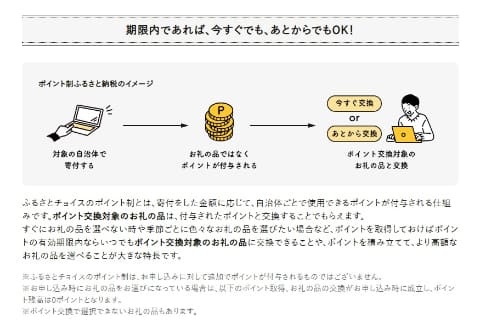 ポイント還元はありませんが、独自のポイント制を導入しているのもふるさとチョイスの特徴。申し込みたい返礼品が決まっていない場合、自治体に先に寄付だけしてポイントを取得し、そのポイントで後から返礼品を選ぶといった使い方ができます。ポイントは翌年に繰り越せるため、ポイントを積み立てて高額な返礼品を選ぶことも可能です。