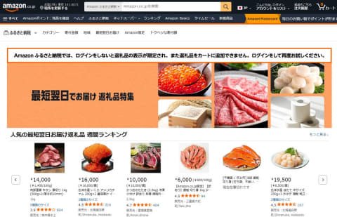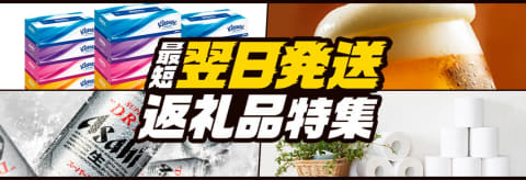 Amazonは、普段のAmazonのお買い物と同じような操作でふるさと納税の申し込みができ、使い慣れたサイトで寄付ができます。また、「最短翌日お届け」という特集ページがあり、すぐに配送される返礼品が一括で確認できるのも特徴です。忘年会や年末年始など、人が集まるタイミングで使いたいものを返礼品として申し込むといった使い方もできます。