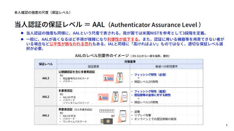 こうしたパスワードは、当人認証の保証レベルとしてはAAL1(パスワード単体での認証)であり、最もレベルが低いという扱いになっている。特にパスワードは「フィッシング耐性がない」という点が問題で、安全性に関しては低い認証方式という扱いだ。