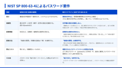 この2つはパスワードの文字種を指定したもの。4番目は特によく言われる、「複雑なパスワード」を否定するものだが、実は以前からすでにこの混在の強制は否定されていた。「混在を強制すべきでない」となったのは、2017年6月のSP 800-63-3の時点で、長期にわたってNISTのガイドラインとして言及されていたが、「複雑な方が安全」と長きに渡って神話として語り継がれていた項目だ。