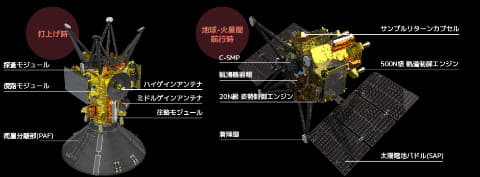 そこで、大型の探査機を「往路」「探査」「復路」の3つのモジュールで構成し、火星圏への航行から帰還まで役割を終えたモジュールを多段式ロケットのように順次切り離して身軽になるというこれまでにない機体設計が考えられています。当初の構想で3,400kg(うち推進薬は2,500kg)だった探査機の質量は、4,200kg(うち推進薬は約2,800kg)に増加し日本の探査機では最大級となっています。