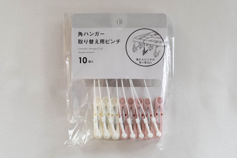 考えるだけで何もしないというダメなゾーンに入ったので、100均に行けば何かあるんじゃないかと足を運んだところ、ありました。「角ハンガー 取り替え用ピンチ」というそのものなアイテムが。