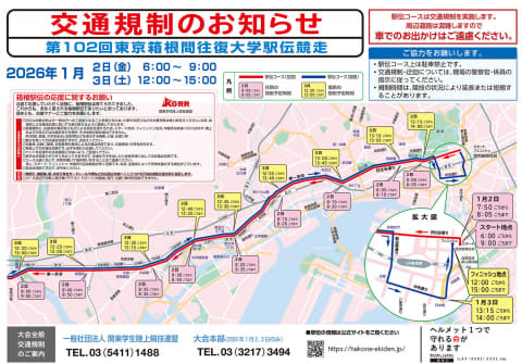 1月3日の復路スタート地点付近では7時30分頃から8時20分頃まで交通規制が実施されます。その後、平塚中継所付近が9時30分頃から10時30分頃まで、戸塚中継所付近が10時50分頃から11時30分頃まで、鶴見中継所付近が11時55分頃から12時40分頃まで、東京都に入る六郷橋付近が12時15分頃から12時50分頃までとなっています。