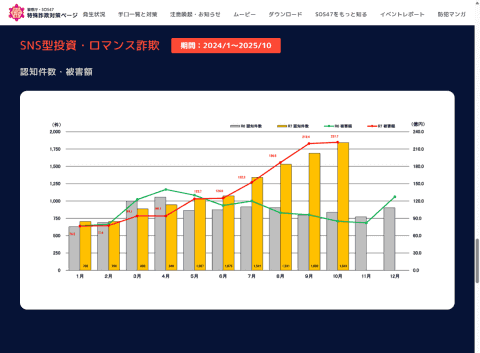 SNSを舞台とした事件としては、SNS型投資詐欺やSNS型ロマンス詐欺も激増しています。警察庁が12月2日に公表した「令和7年10月末における特殊詐欺及びSNS型投資・ロマンス詐欺の認知・検挙状況等について(暫定値)」によると、前年よりも被害が大幅に増加しています。SNS型投資詐欺ではInstagramの被害が最多で、次いでYouTubeとなっています。SNS型ロマンス詐欺では、マッチングアプリが最多、次いでInstagramになっています。どちらも、LINEのやり取りに持ち込まれて金銭をだまし取られています。