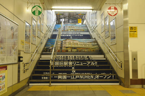 両国駅の魅力を向上させる取り組みは、それだけではありません。駅コンコースには気品溢れる赤絨毯を敷き、そこをギャラリースペースへと転換。貴重な写真を展示するほか、イベントスペースとして活用されています。