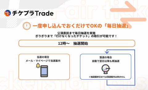 リセールでのチケット購入は基本的に抽選で、申込後から公演日の直前まで、毎日正午に抽選結果が反映されます。その日の抽選で落選しても、リセール最終日まで申し込み内容は維持されており、翌日の抽選も対象となる仕様です。なおチケプラには先着販売の仕組みもありますが、基本は抽選制を採用しているとのこと。