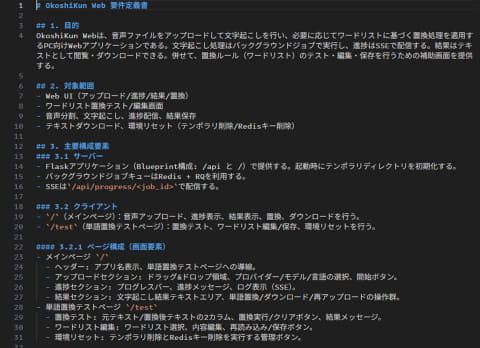 既存のコードを参考にしてもらうとイメージが固定されてしまいそうなので、いったん現状のコードを元にOpenAI Codexに要件定義書(OkoshiKunWeb_requirements.md)を作成させました。この要件定義書のみを資料として、あえてデザインの方向性は示さずに、下記プロンプトを各AIエージェントに投げます。
