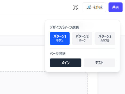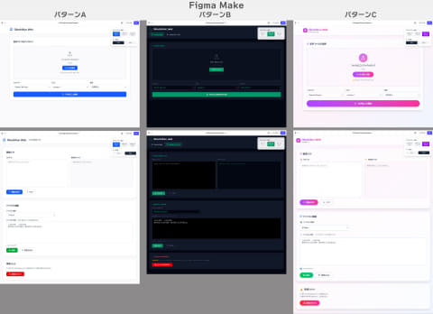 Figma Makeは他よりもシンプルで、とにかく使いやすさを意識したような作り。パターンの変化こそ少なめですが、一番実用性の高いUIに思えます。画面右上に見えるポップアップのようなものは、3パターンのデザインをボタンクリックで切り替えて確認できる機能を自発的に追加してくれたもので、このような実務作業まで考慮したコーディングの仕方はデザイン特化型ツールの良さと言えるでしょう。