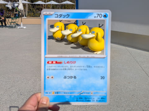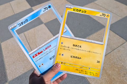 トレーナーズマーケットではこのほか、グッズ販売やアトラクションなどもあります。たとえば、ポケモンカード型のフォトプロップスを受け取り、カードに合うポケモンをそのプロップス越しに撮影。撮った写真を店舗に見せると、オリジナルステッカーが無料でもらえます。