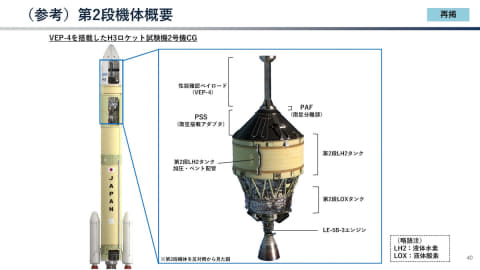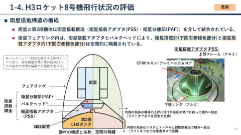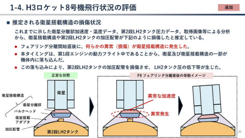 飛行中に衛星がロケットから脱落するという異常とこれまでわかっている第2段のLH2タンクの圧力低下との関係ですが、衛星搭載部は第2段のLH2タンクの上に取り付けられています。衛星搭載構造が機体に落ち込んだことで、LH2タンクの配管を損傷させてしまい、タンク圧が下がるといったトラブルが起きたと推定されています。