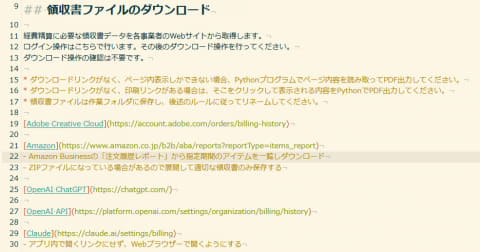ですので、最初に人間がすべきことは、経費を申請するためにいつも行なっている作業をできるだけ細かく書き出すこと。ECサイトのどこから領収書をダウンロードできるのか、ダウンロードやスキャンした領収書のデータはどういう形式のどういうファイル名で保存しているのか、経費精算システムではどんな手順や判断基準で情報入力しているのか、などなど……。