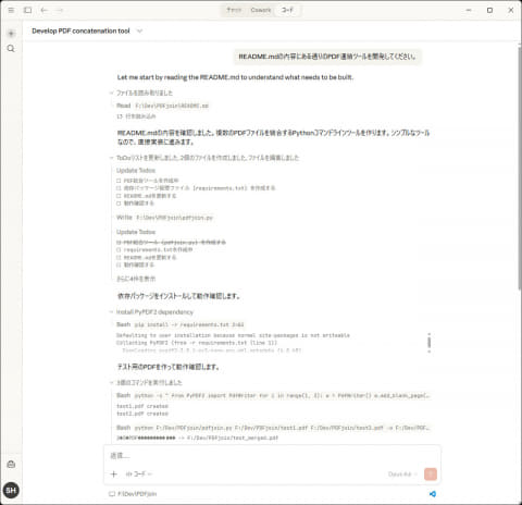 それ以外のほとんどはClaude Coworkが(時間はかかるけれど)こなしてくれます。ただし、なかにはClaude Coworkが普通に処理してくれるものの、おそらく内部的にはプログラムを作成したうえで実現しているだろうと思われる作業もあります。たとえば複数PDFファイルのマージがそれです。