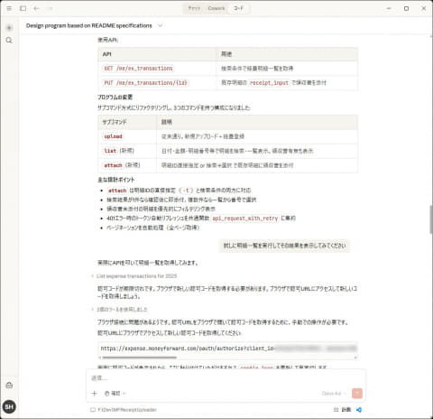 認証処理に用いるAPIキーの取得など最初だけ少しの手間はかかりますが、必要な情報をまとめたうえでこれもClaude Codeにお願いすれば、API連携でデータ更新や領収書アップロードを可能にするプログラムを作成してくれます。このようにして作成したツール類とClaude Coworkを組み合わせることで、より効率的な作業が可能になるはずです。
