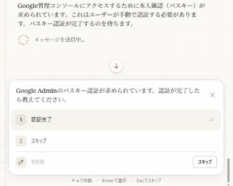 作業の続行確認が必要なときは、以下の選択肢を提示する: