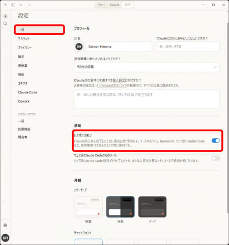 また、ユーザーが他の作業をしていると、Claude Coworkが作業を終えた(ユーザーにログイン操作や作業判断を求めている)ことに気付けないこともよくあります。なので、すぐに作業の続きを指示できるように、あらかじめClaudeのデスクトップアプリの設定で「通知」機能をオンにしておくのもおすすめです。