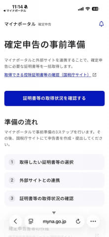 「確定申告コーナー」では毎年「マイナポータル連携」が強化されていますが、この事前準備が必要で、マイナポータルで確定申告を選ぶと、まずは「確定申告の事前準備」が表示されます。