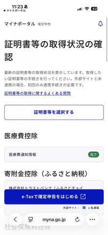 筆者の場合、今回の確定申告で必要な証明書は、「ふるさと納税」(寄付金控除に関する証明書)と「給与」(給与所得の源泉徴収票情報)だけです。ただし、「医療費通知情報」や「生命保険料控除証明書」「地震保険料控除」「iDeCo」なども、すでにマイナポータル連携済みで、証明書等が取得できる状況になっています。